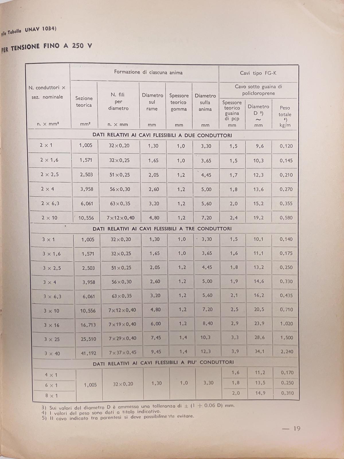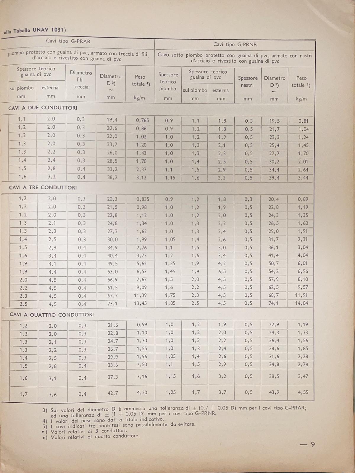Tabelle relative ai cavi elettrici